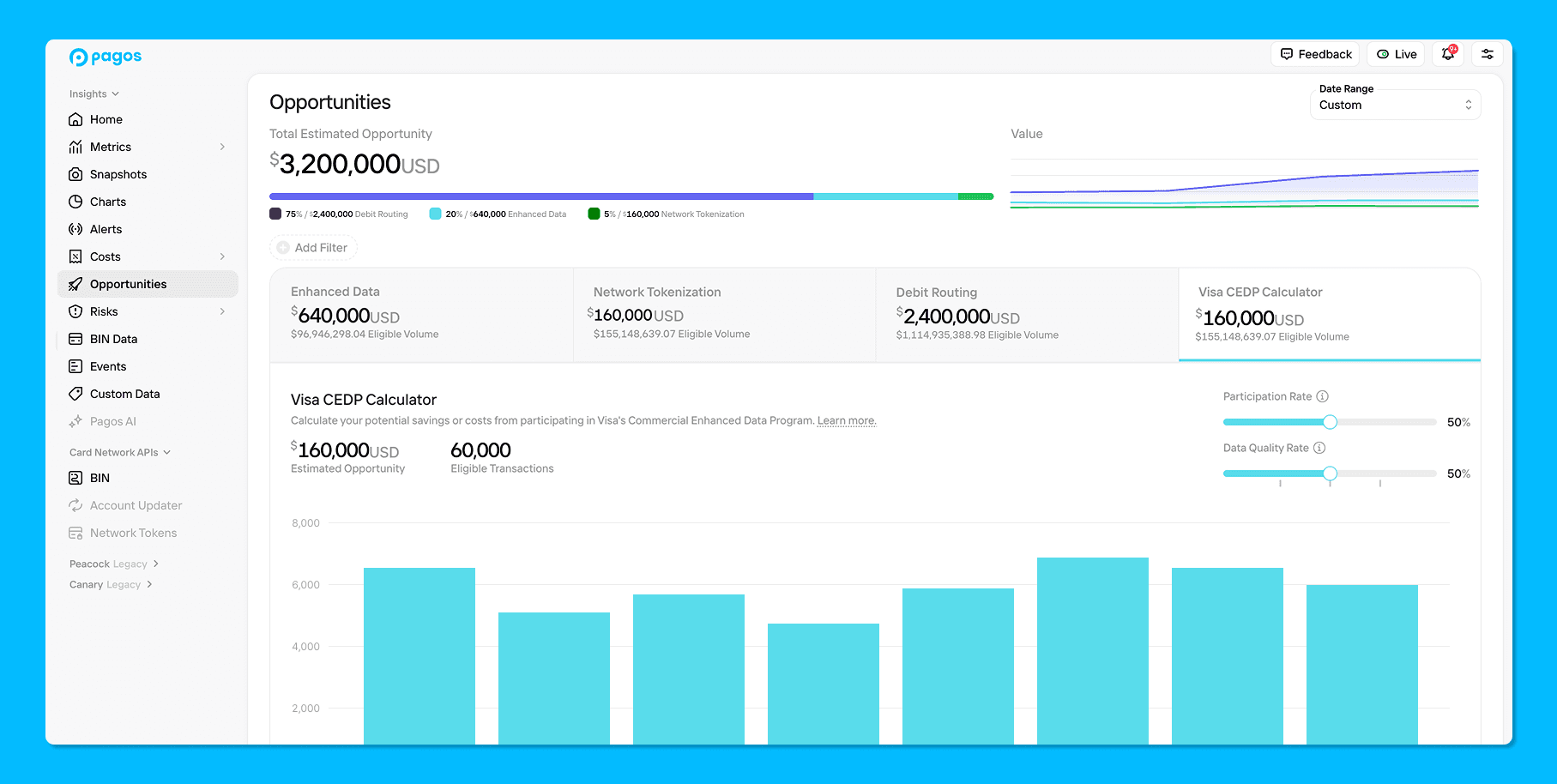 You'll find the new Visa CEDP Calculator in the Opportunities section of Pagos Insights. Your eligible volume will populate automatically; from there, use the sliders to reflect your situation and see your net estimated savings.